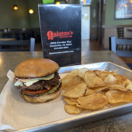 Quinton's Gourmet Burgers are sourced locally. All 6oz burgers are seasoned, hand-pattied and served on a Brioche bun with homemade fries.Substitute chicken for no additional charge or a plant based burger for $4. Upgrade to curly fries, sweet potato fries, dinner salad or coleslaw for $3.00 Double the meat and cheese for $6.00 Add an egg to any burger $1.50 Substitute a gluten-free bun $2.00